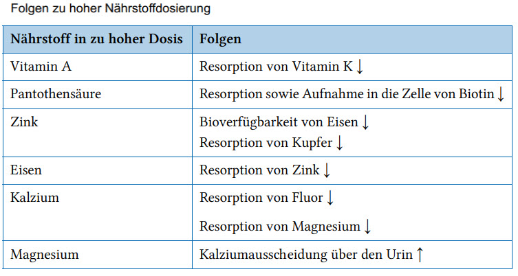 Einzelnen Nährstoffe können überdosiert angewendet werden, ohne das man es selbst merkt. Das kann die Aufnahme anderer Nährstoffe beeinträchtigen. Tab. 3.1 zeigt Beispiele, wie sich Nährstoffe gegenseitig beeinflussen können. Kalzium beeinflusst den Magnesiumspiegel und umgekehrt. Gleiches