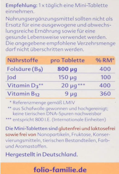 - Frauen, die mit der Einnahme von Folsäure weniger als 4 Wochen vor der Konzeption begonnen haben, sollten höher dosierte Präparate mit 800 µg Folsäure verwenden.